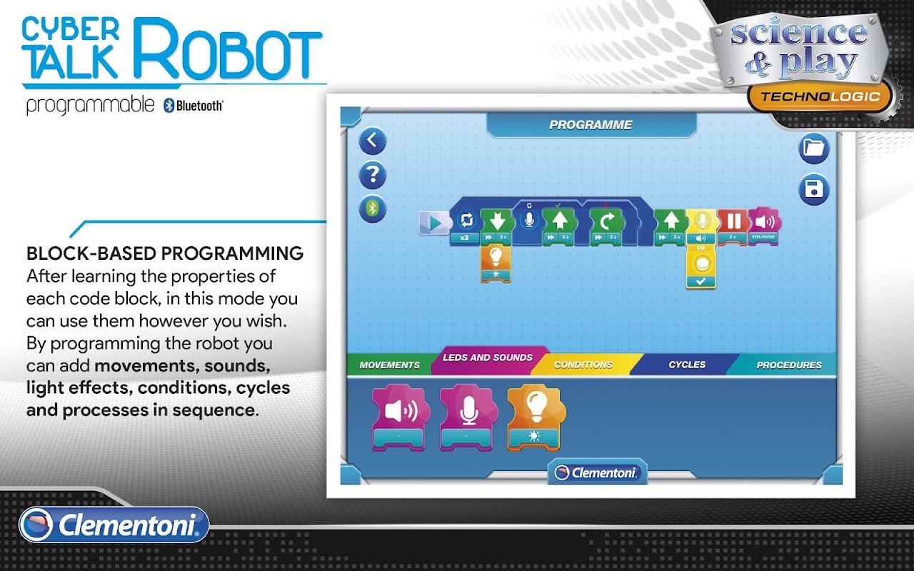 Cyber Talk is the perfect combination between fun and educational properties. Through this robot and its programming activities, you can learn the principles of coding – a very important subject that stimulates the mind so that it can solve queries and problems – while having fun by recording, editing and sending voice messages.
