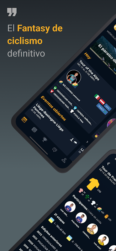 Pick your riders before each race, compete in real professional cycling events and score points based on official results. Test your strategy, challenge your friends and prove you have the best cycling knowledge.