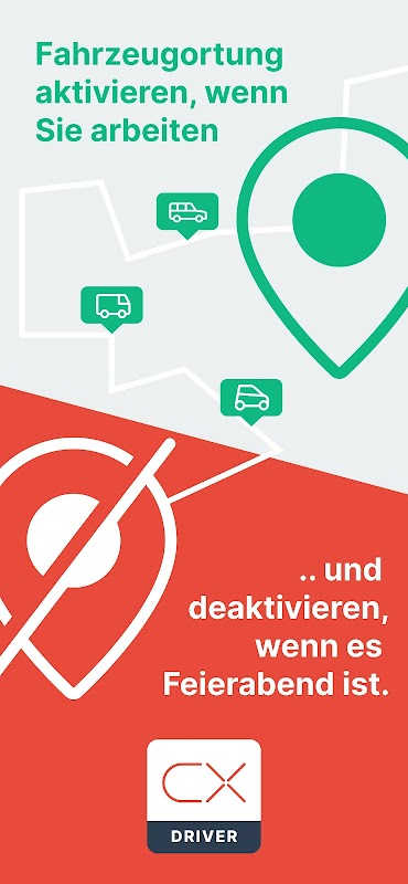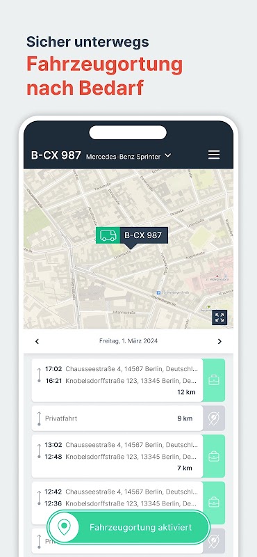 Find parking spaces immediately: Parking space location after driver change! The new driver can use the Cynatix Driver App to see the vehicle's location and display the route. In private mode, the vehicle remains invisible - only the last location with activated tracking is visible, private locations remain hidden for everyone and forever.