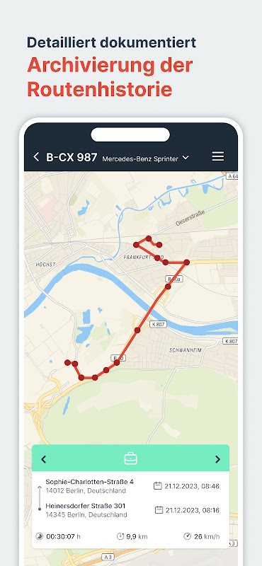 Full flexibility: vehicle selection with one click! If several vehicles are assigned, the driver simply selects from the clear drop-down menu and can set off immediately. Everything for a smooth ride - anytime, anywhere.