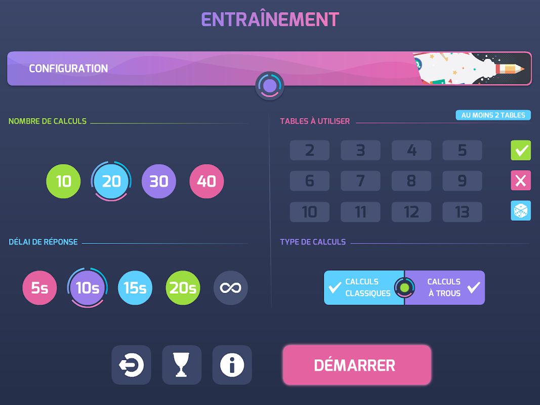 Each exercise is customizable (choice of tables, the type of calculation, and, depending, of time limit or level of difficulty.
