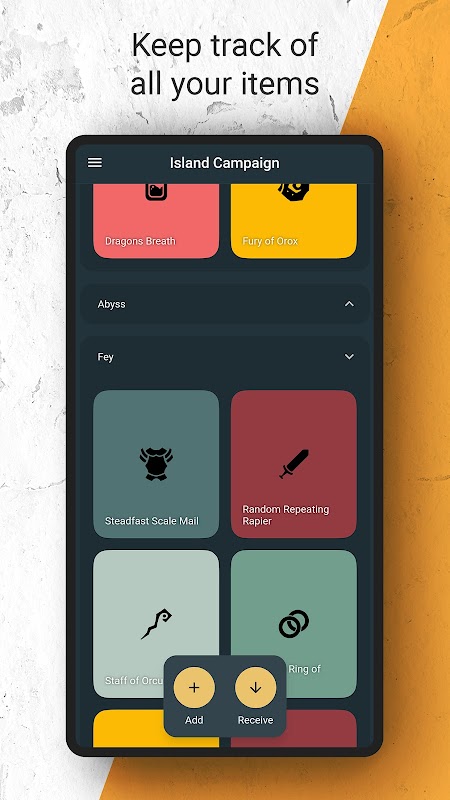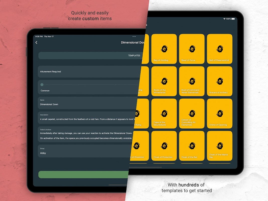 D&D Homebrew Items helps you keep track of magical items in your D&D campaigns. Think of it as a bag of holding for all the magical loot you pick up through the campaign. Never again miss an opportunity in the heat of battle because you forgot about that one clutch item.