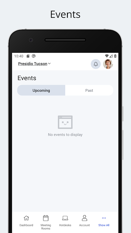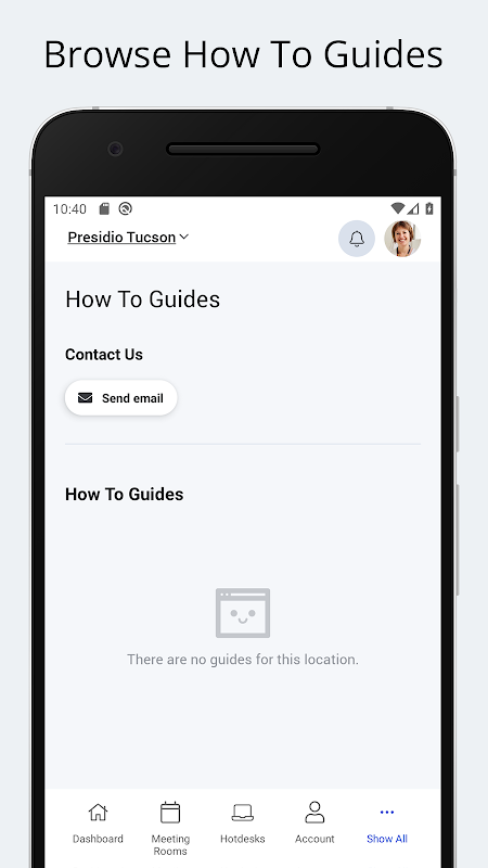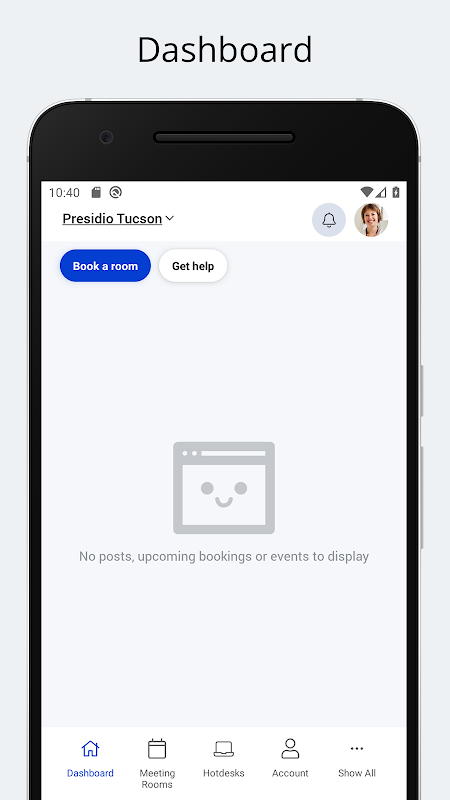 Book meeting rooms, book daily desks, manage account, manage mail service, contract info, news updates.