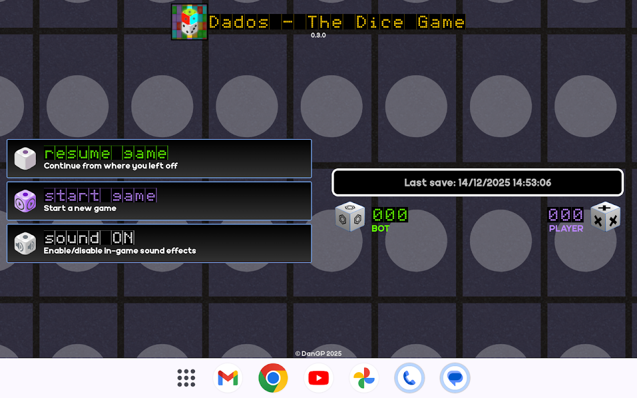 Dados is a casual game inspired by some dice-based board games where the aim is to check off as many boxes in the matrix as possible. In each spin, you have 6 dice (3 numbered, 3 coloured) and you need to select 2 dice in each spin to then check off the matching colours in the matrix grid.