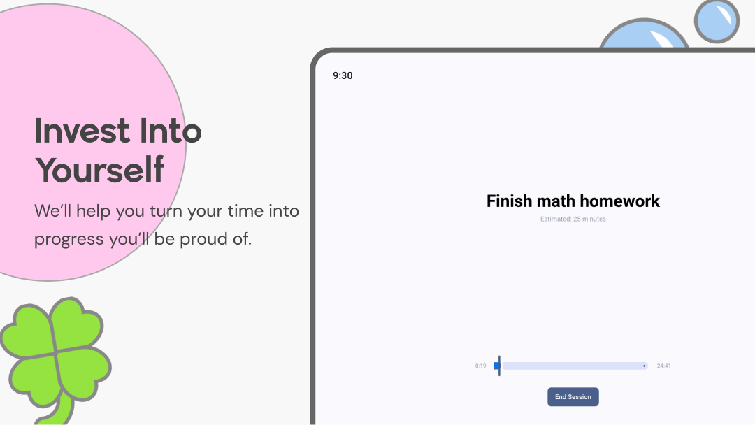 Use the focus timer while working on tasks. Get reminders to keep you on track. Works as a screen blocker to help you concentrate and study.