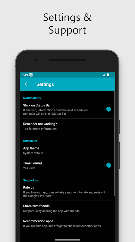 • Information about the next scheduled reminder will stick on Status Bar, you can disable it from settings screen.