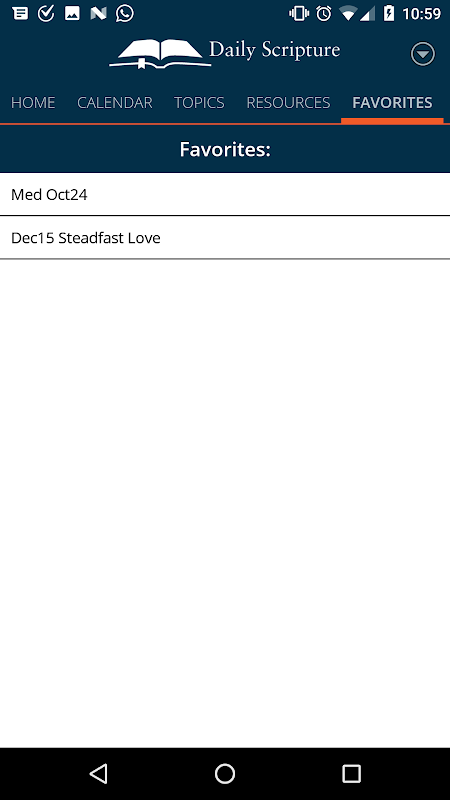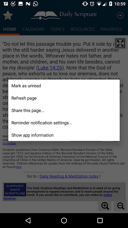 The Daily Scripture app is an aid for daily prayer and meditation on the Scriptures. It provides a short Scripture reading for each day of the year from one of the four Gospel texts, followed by a meditation, written by Don Schwager based on the Scripture passage, along with a prayer and a few verses from the Book of Psalms.