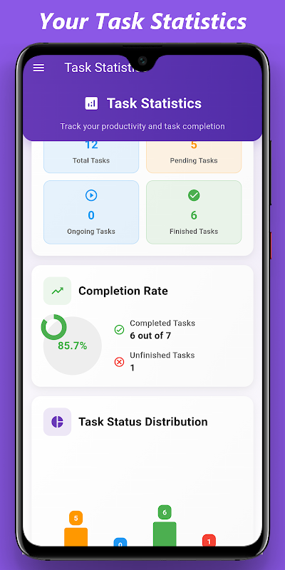 Gain valuable insights into your work habits with detailed analytics. View completion rates, track finished versus unfinished tasks, and identify patterns in your productivity. The statistics section provides motivation through clear visual representations of your achievements.