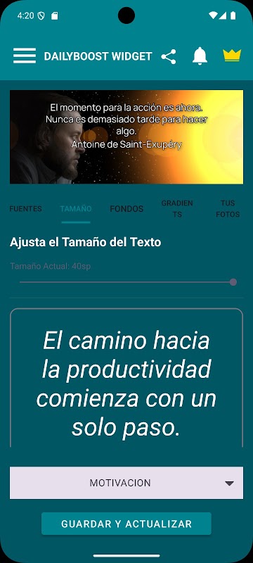 Easy to Set Up: Our new welcome guide will help you set up your first widget in seconds. • Daily Inspiration: Receive a new quote every day to keep you focused, positive, and motivated. ⭐ UNLOCK YOUR POTENTIAL WITH PREMIUM ⭐ Take your experience to the next level with DailyBoost Premium and access exclusive features: • NEW! BACKGROUNDS WITH YOUR OWN PHOTOS: The best motivation is personal! Use any photo from your gallery as the widget background and create something truly unique. • Floating Widget: Access your quote of the day from any app with a widget that's always visible. • Ad-Free Experience: Zero interruptions. Just you and your inspiration. • Exclusive Content: Access premium fonts and backgrounds reserved only for subscribers.