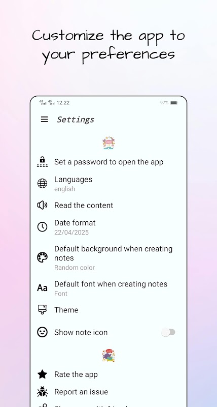 👉 Allows you to set a lock to open the app, turning it into your personal diary. You can also lock by category or set a lock on individual notes.
