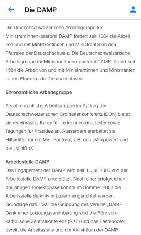 The German Swiss Group of altar girls-pastoral DAMP since 1984 promotes the work by and with acolytes and altar boys in the parishes of German Switzerland. As a volunteer working group on behalf of the German Swiss Ordinarienkonferenz (DOC) she regularly offers courses for leaders and managers as well as meetings for Praesides. She also developed tools for mini-pastoral, as the "Mini Power" and the "mini box".