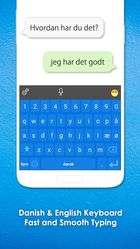 Danish english keyboard for whatsapp typing. English, Danish keyboard with emoji is literally filled with maximum colored background themes and keypad skins with emojis and smileys. Danish offline keyboard works completely without internet availability.
