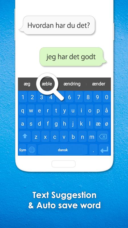Learn the Danish and English and have perfection in it via new Danish keyboard and English keyboard, really finest Danish language keypad. English convert to Danish & English keyboard is prompted with basic quality of switching to next language in seconds. Danish language keyboard with English is designed for local and international users. The typing of English language and Danish language is easy for mobile users.