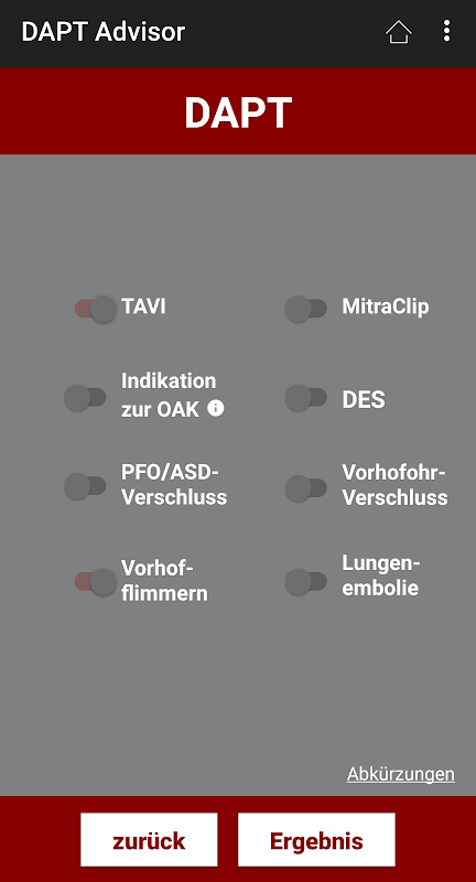 Die App DAPT Advisor bietet ein klares und eindeutiges Antikoagulationsregime (Welche Medikamente? Wie kombinieren? Wie lange?) für jeden einzelnen Patienten abhängig vom erfolgten kardialen Eingriff, z.B. nach Stentimplantation, TAVI oder nach Myokardinfarkt. Die Grundlage der Empfehlungen sind die aktuellen Leitlinien der deutschen und europäischen Gesellschaft für Kardiologie (DGK und ESC).
