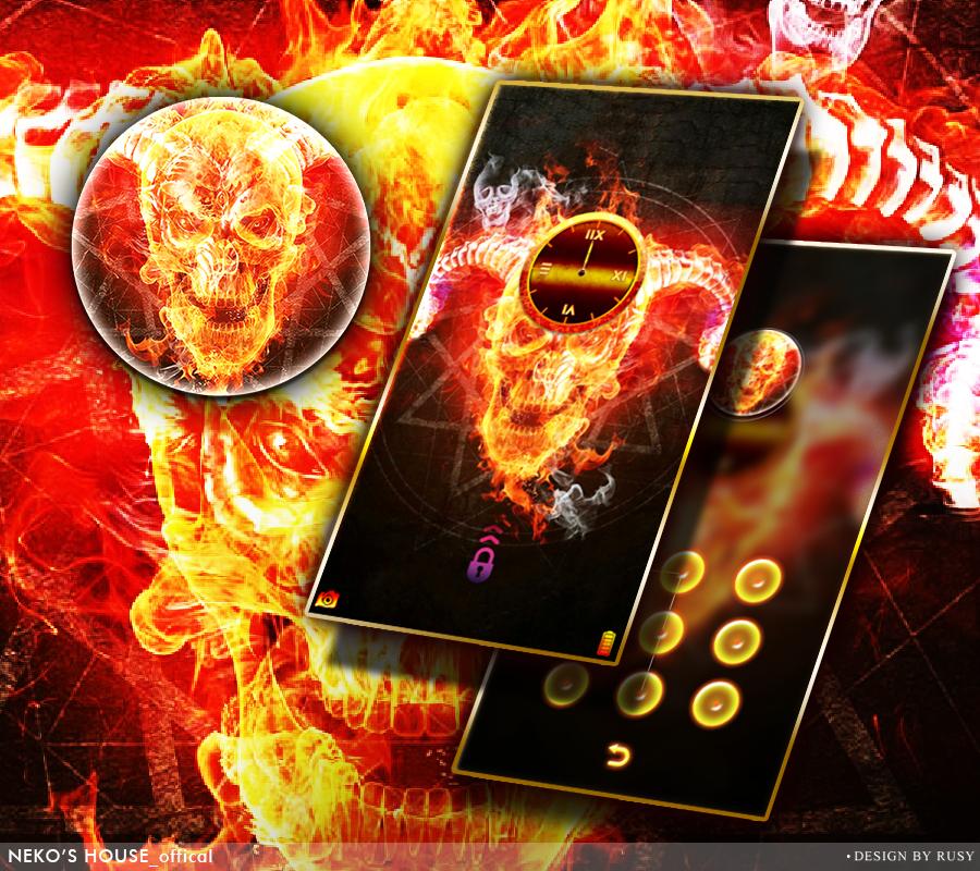 Dark Flame(Fire) Horn Skull Theme lock screen design directly using the golden cool wallpaper, black&golden lock screen mode. Lock screen button with a simple eye protection&texture design,confrom to the cool&fantasy taste. Dark Flame(Fire) Horn Skull Theme contact using the flame(fire) horn skull wallpaper and the shape of the golden texture button &white smoke design, so that your fingertips will feel a different button-press experience~~~
