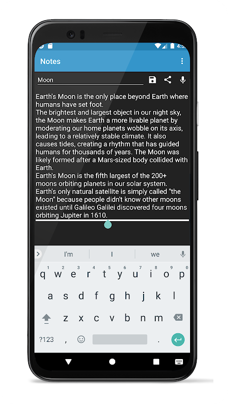 Fast and convenient notepad, notebook in dark theme. Take notes and share them. Works without internet and for free. You can even record text with your voice. Just click on the microphone and speak. The app converts your speech to text. The application saves your notes as a text file. You can also manage your recordings from the main menu.