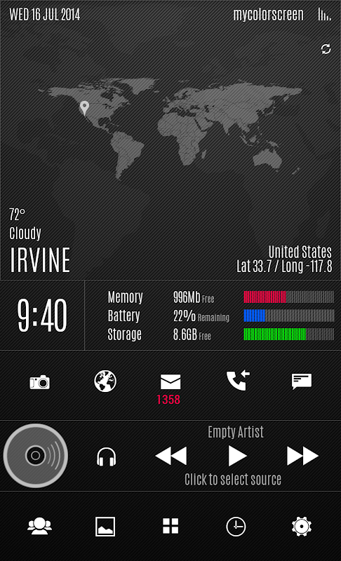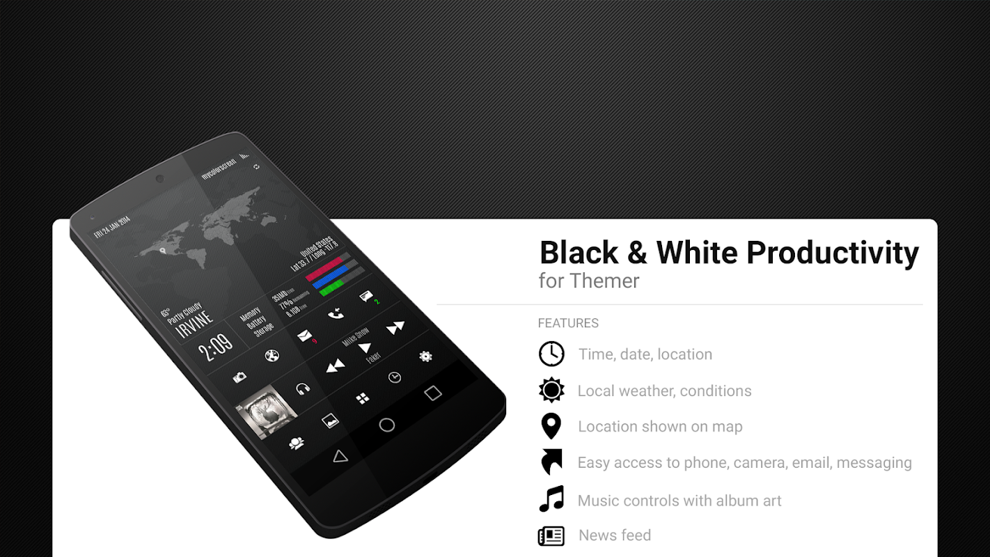 This dark, flat theme is perfect for a professional look on your home screen thanks to its classic black and white design. Experience the utmost in productivity with access to your extended agenda, music controls, and more. This theme applies instantly and contains all widgets, wallpaper, and icons needed to complete the look.
