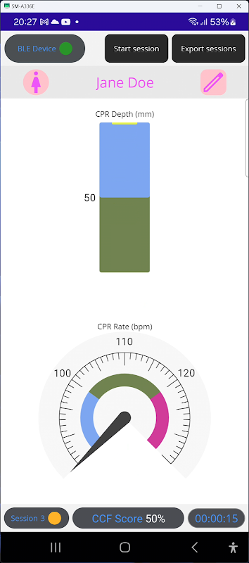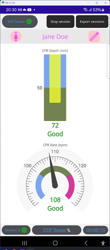 Get real-time feedback on compression depth and rate while tracking your Chest Compression Fraction (CCF) score for optimal CPR performance.