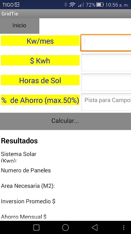 Para el sistema Grid Tie, necesitaras ingresar el número promedio de Kilowatts por mes que consumes, el costo del kw que te cobra tu proveedor y el nivel (porcentaje) de ahorro que quieres obtener implementando el sistema con los paneles solares.