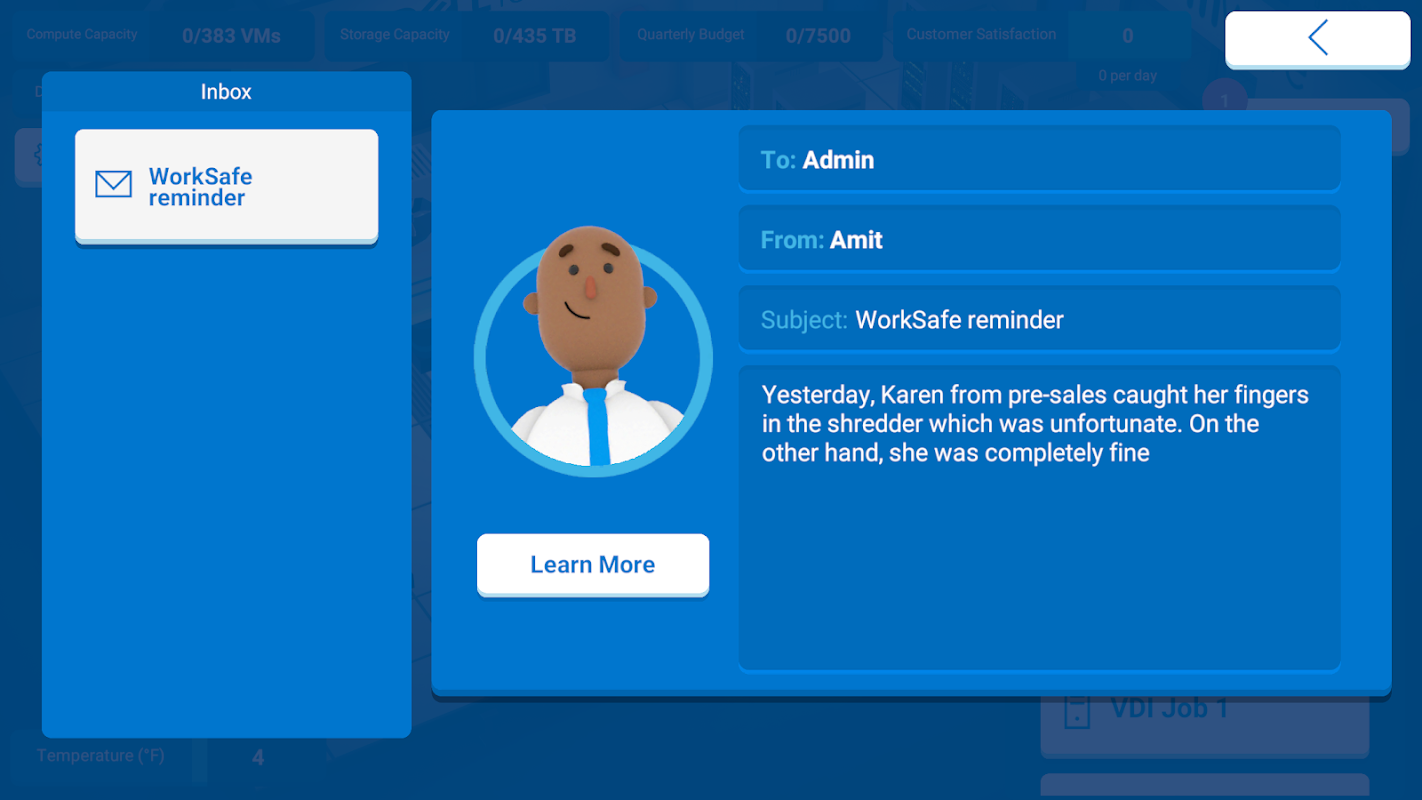 Modernize and transform your infrastructure to meet the demands of the business and keep your team satisfied. Overcome challenges to earn extra databucks that you can use to upgrade your data center. Put your management skills to the test with Data Center Sim today!