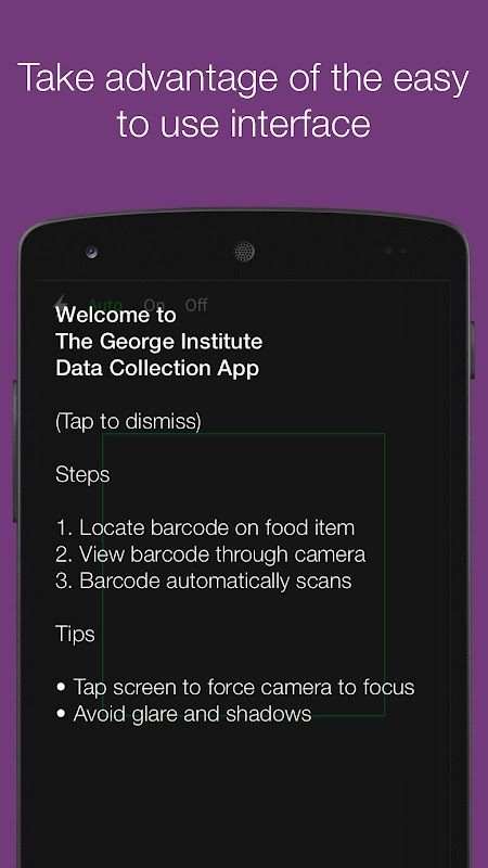 "App overview – The George Institute Food Data Collector App helps users scan barcodes of food items and take photos of the nutritional information on the packaging. Images are transmitted to The George Institute for data entry and processing. Data is collected within a defined work program with a view to undertake research to improve the health of millions. The DCA is only available for use after consultation with The George Institute.