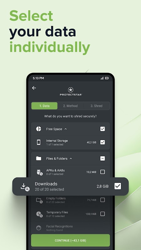 1) Select what to erase: files, folders, app data, empty space or storage areas.