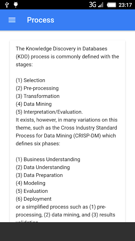 Data mining is the computational process of discovering patterns in large data sets involving methods at the intersection of artificial intelligence, machine learning, statistics, and database systems It is an interdisciplinary subfield of computer science.The overall goal of the data mining process is to extract information from a data set and transform it into an understandable structure for further use. Aside from the raw analysis step, it involves database and data management aspects, data pre-processing, model and inference considerations, interestingness metrics, complexity considerations, post-processing of discovered structures, visualization, and online updating Data mining is the analysis step of the "knowledge discovery in databases" process, or KDD.