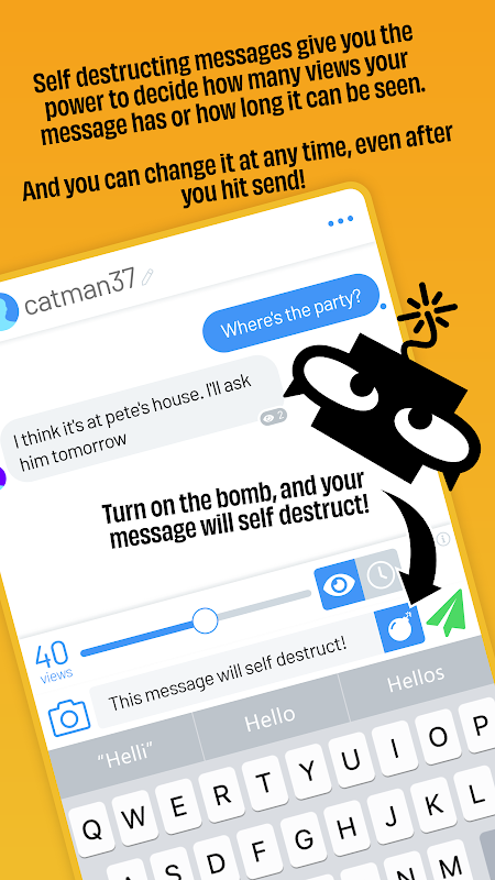 Safety first: control over conversations even after you hit send. Stay private even after they are sent. Nuke conversations on both the sender and recipient devices for privacy. Messages can be unsent at any time with ease and vanish without a trace when they reach view limits or are manually destructed.