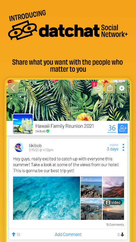 Stay safe: DatChat delivers a safe space for private posts and messages with your social network. Social posts are kept secure and out of the wrong hands. Stay private and avoid screenshotting with our proprietary anti-screenshot protection, and receive notifications if someone tries. Group message your friends, family and social network with end-to-end encrypted connection.