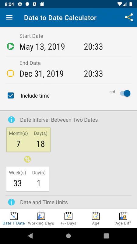 Finding difficulty calculating the number of working days or number of days between two days? It's time to make this simple calculation, even more, simpler with "Date Calculator" app. In just one click you can easily calculate the difference between to dates or calculate the number of working days. The app is very useful and helps you in estimating your plans. You can also calculate the exact difference accurate up to minutes. The "Date Calculator" is just awesome with Dates.