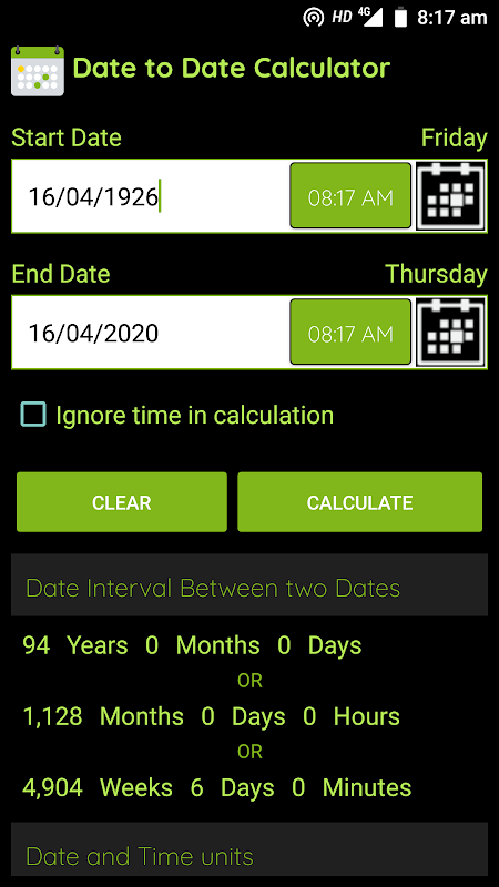 This is a simple and awesome date and time app that calculates the duration between two dates, including time such as total years, months, days, weeks, hours, minutes, and seconds. It's also useful for finding date differences between events like work anniversaries, birthdays, holidays, and other important dates. The app offers a quick and simple user experience when performing date manipulations such as date-to-date calculations, adding or subtracting from a date, finding leap years, weekday calculations, and age calculations. Calculating time and dates is easier with this app than any other application on the Android platform.