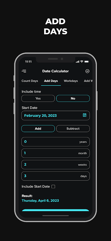 - Add to or subtract days from a date: Our application enables you to effortlessly add to or subtract date and time units from any given date. Whether you're setting up a deadline or adjusting a schedule, this calculator ensures that you have the flexibility to manipulate dates as per your requirements.