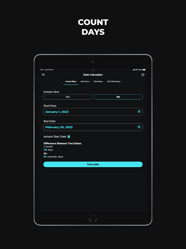Our Date & Time Calculator is a powerful tool packed in a simple and elegant interface. It’s not just a days calculator; it’s your calendar wizard, your scheduling partner, and your date range specialist. Whether you’re calculating days for fun or scheduling workdays, this app is an essential addition to your toolkit.