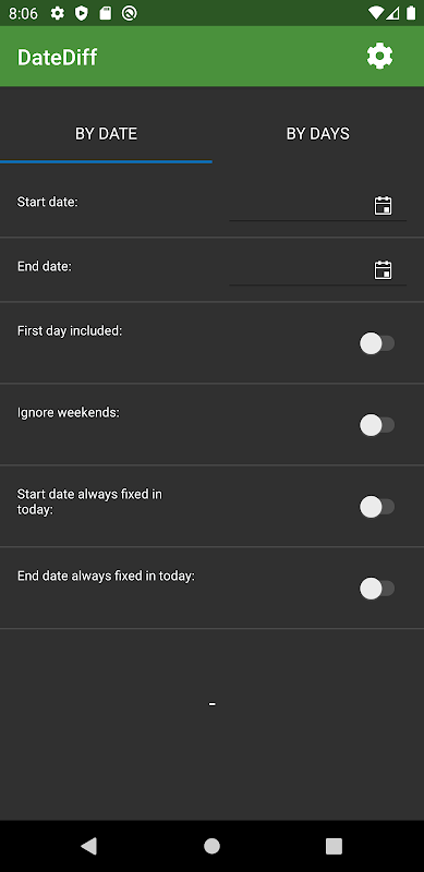 It allows setting up the 2 dates and it will calculate how many days are in between, allowing ignore weekends or not. Also, it allows setting up a start date and a number of days and it will calculate the end date. Even more, it let you pin start date as always today to have a days countdown to a specific date.