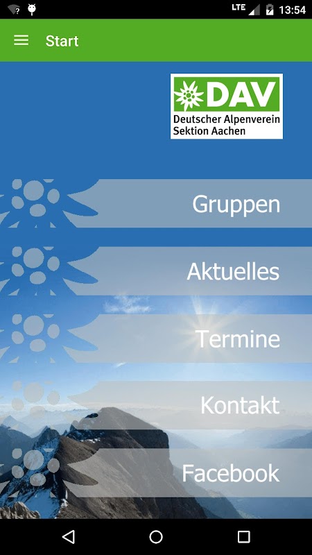 App der Sektion Aachen des Deutschen Alpenvereins e. V. zur Präsentation des Vereins. zum Abstimmen und Kommunikation von Terminen und zur Echtzeitkommunikation via Chat und Push Nachrichten.