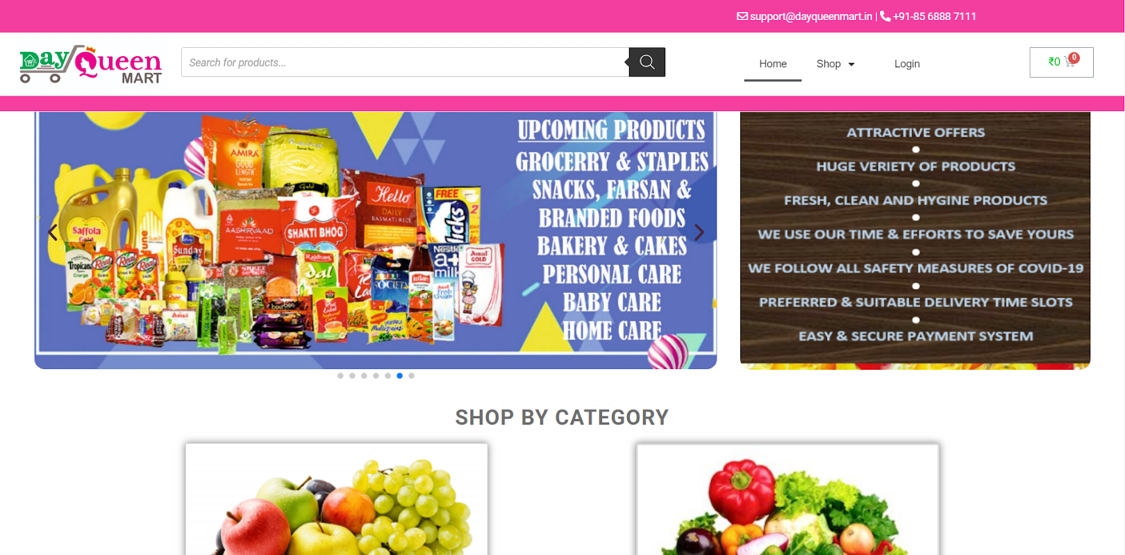 dayqueenmart.in (DAYQUEEN MART) is an online food, grocery and daily needs store. Right now we are serving with fresh Fruits and Vegetables, but we also serve with other categories from Groceries and Staples, Dairy & Beverages, Packaged products, Personal care, Home care and baby care. You Choose from a wide range of options in every category, exclusively handpicked to help you find the best quality available at the lowest prices. Select a time slot for delivery and your order will be delivered right to your doorstep. You can pay online using your debit / credit card or by Cash / UPI on delivery.