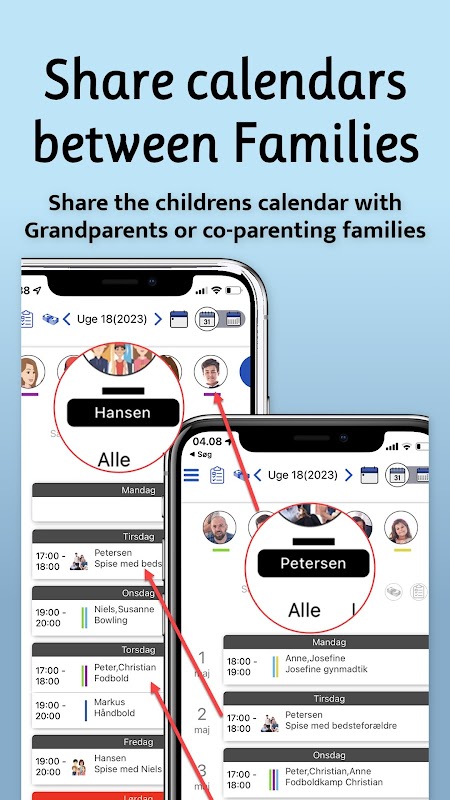 This way, parents can share their children's calendars with each other while having their own Daysi Calendar. This function can e.g. also used by grandparents so they can be a part of the grandchildren's everyday life and make appointments with them.