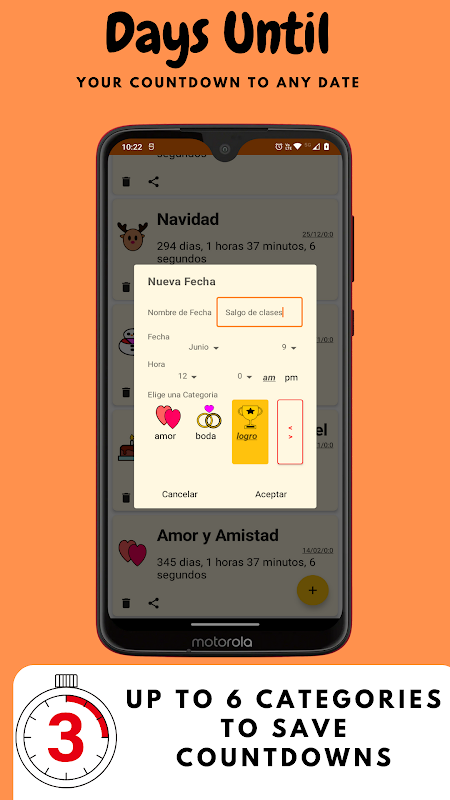 You can organize your dates by different categories and icon will randomly change every time you open the app. By the moment you have up to 6 categories to use: