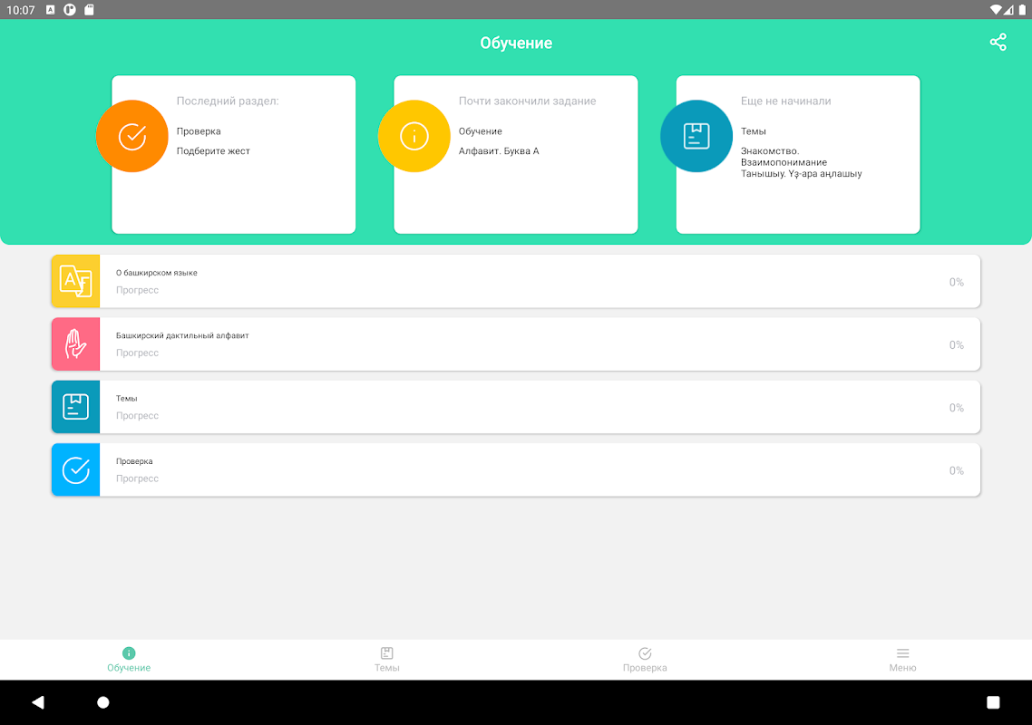 Gebärdensprachübersetzung und Synchronisation in Baschkirisch und Russisch. Mehr als 40 interaktive Übungen sind in der Anwendung implementiert, um das gelernte Material zu festigen.