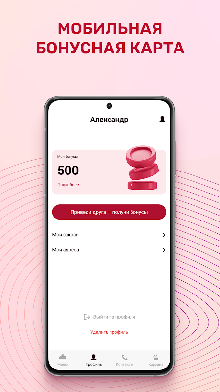 In der Anwendung können Sie schnell und bequem Essen bestellen, ein profitables Bonusprogramm mit Cashback,