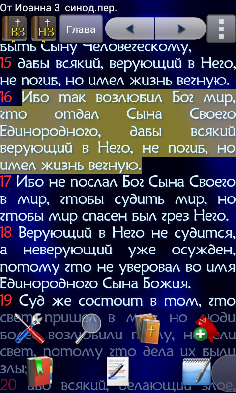 Angehängte zwei Übersetzungen: Russian Synoden Übersetzung moderner als diese Anwendung ermöglicht es Ihnen, weitere Übersetzungen zu verbinden, einschließlich Kommentare Barkley (Link zum Download und Installationsanweisungen, http://algo-rithm.ru/androidprojects).
