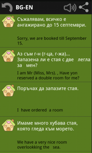 Можете да чуете всеки английски израз, чрез използване на стандартния TTS (ако е инсталиран) на вашия телефон. Научете основни фрази на английски, необходими за пътуването. С този разговорник ще бъдете уверени във всяка ситуация.
