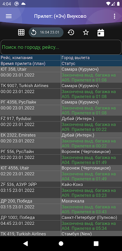 ➤ DATEN im Board: Abflug-/Ankunftszeit, Flugstatus, Abweichung vom Flugplan der offiziellen Website www.vnukovo.ru/. Und außerdem - Check-in-Schalter, Gate-Nummer usw.