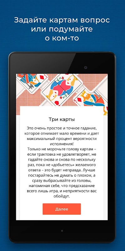 Wir wünschen Ihnen viel Spaß beim Wahrsagen auf drei Karten. Hinterlassen Sie Ihr Feedback und Ihre Vorschläge. Dies wird uns helfen, die Anwendung noch besser zu machen. ☺
