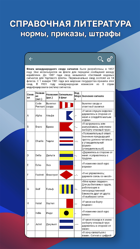 - Riesige Bibliothek mit Referenzinformationen mit Suche und Lesezeichen: Ausrüstungsstandards, Befehle, Navigationsregeln, Bußgelder, Knoten, Sperren und vieles mehr