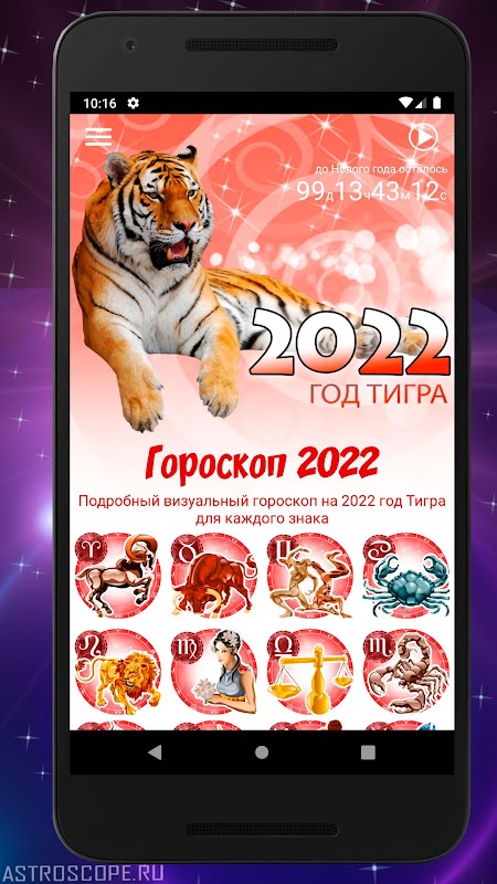 Jeder, der die Anwendung installiert hat, erhält das Maskottchen von 2022 für seine Verwendung. Indem Sie ein Hintergrundbild mit dem Bild eines Tigers auf dem Bildschirm platzieren, gewinnen Sie die Gewissheit, dass die Gastgeberin von 2022 Sie über die gesamte Länge unsichtbar unterstützt. Nicht umsonst sind maßgebliche Astrologen davon überzeugt, dass jeder, der die Chancen dieser Zeit nutzen möchte, einen Talisman mit den Symbolen des Jahres haben sollte.