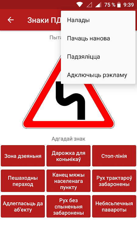 1) Die richtige Antwort wählen. Das Programm zeigt ein Verkehrszeichen und Sie müssen eine richtige Antwort unter mehreren Optionen auswählen.