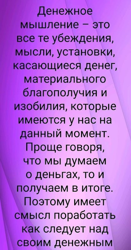 Денежное мышление – это все те убеждения, мысли, установки, касающиеся денег, материального благополучия и изобилия, которые имеются у нас на данный момент. Стратегия мышления богатых людей направлена на развитие, а мышление бедных скованно страхом потерь, неудач - ограничивающими убеждениями. Вот в чём разница мышления богатого и бедного человека.
