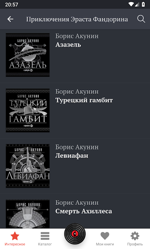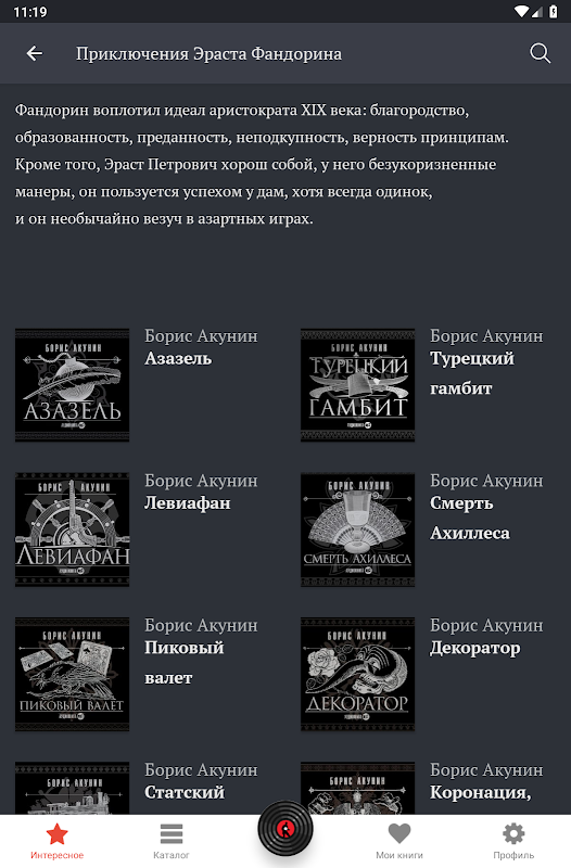 Abonnieren Sie und erhalten Sie Zugriff auf die gesamte Bibliothek. Verbringen Sie Ihre Freizeit mit Vergnügen - hören Sie so viele Bücher gleichzeitig. Die Abenteuer von Fandorin und Sherlock Holmes, die aufregenden Detektive von Y. Nesbyo und die mysteriösen Geschichten von Agatha Christa - und dies ist nur der Anfang einer endlosen Liste. Boris Akunin, Frank Tilier, Arturo Perez-Reverte, Dan Brown, Alexandra Marinin, Edward Khrutsky, Nikolai Svechin, Mario Puzo - die neuesten und beliebtesten Bücher erscheinen jeden Tag in der Bibliothek.