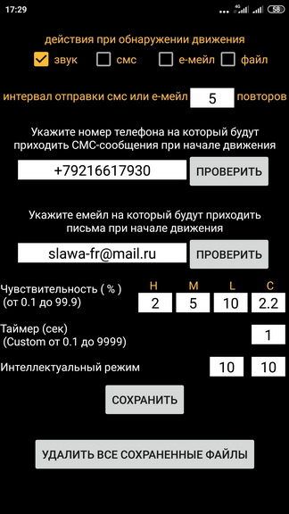 например, для использования в качестве фотоловушки или для безопасности своего дома, гаража, квартиры. Программа оповестит Вас при помощи СМС-сообщения и сообщения на электронную почту,